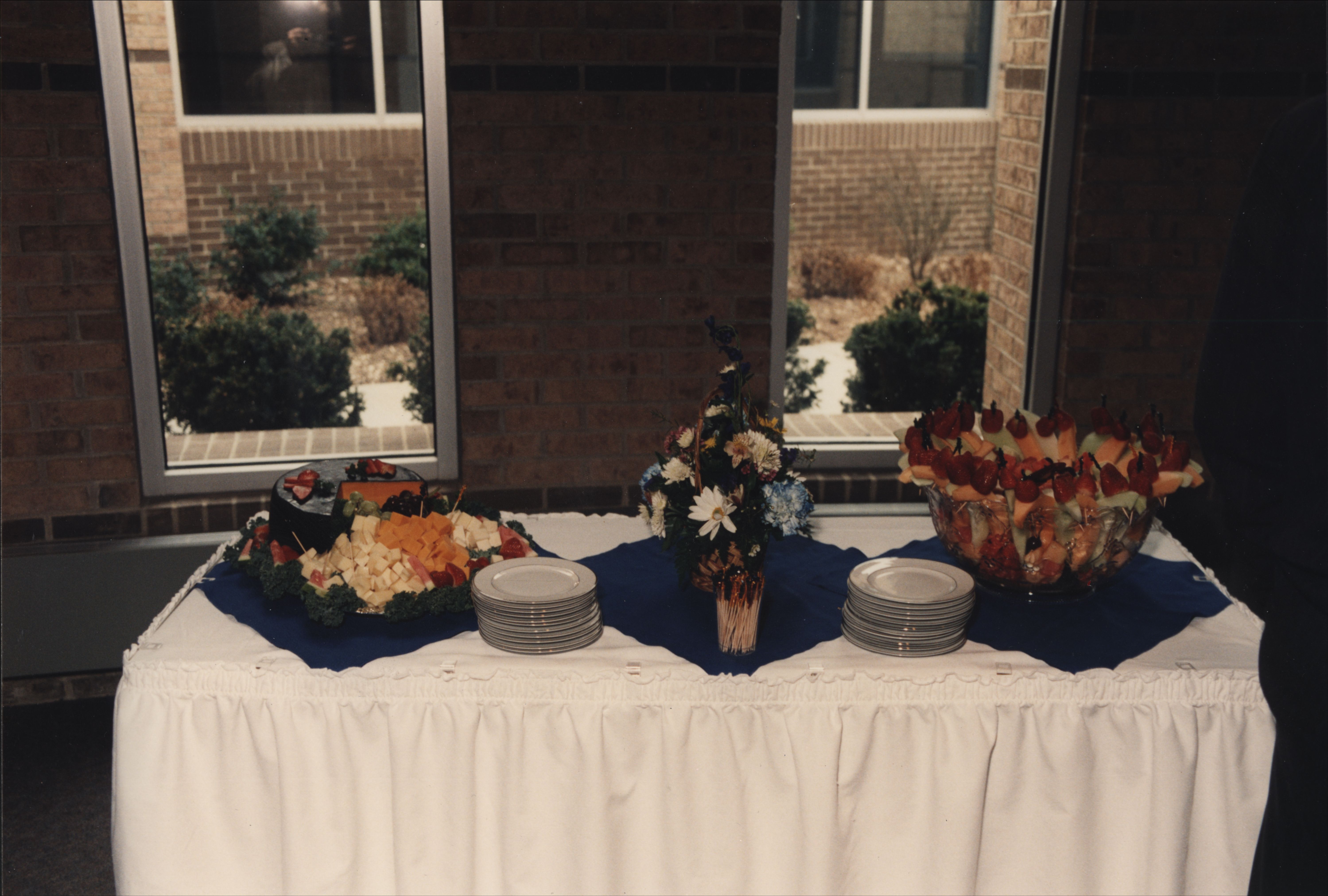 A table for an event with a cheese platter and a fruit bowl. Date unknown.