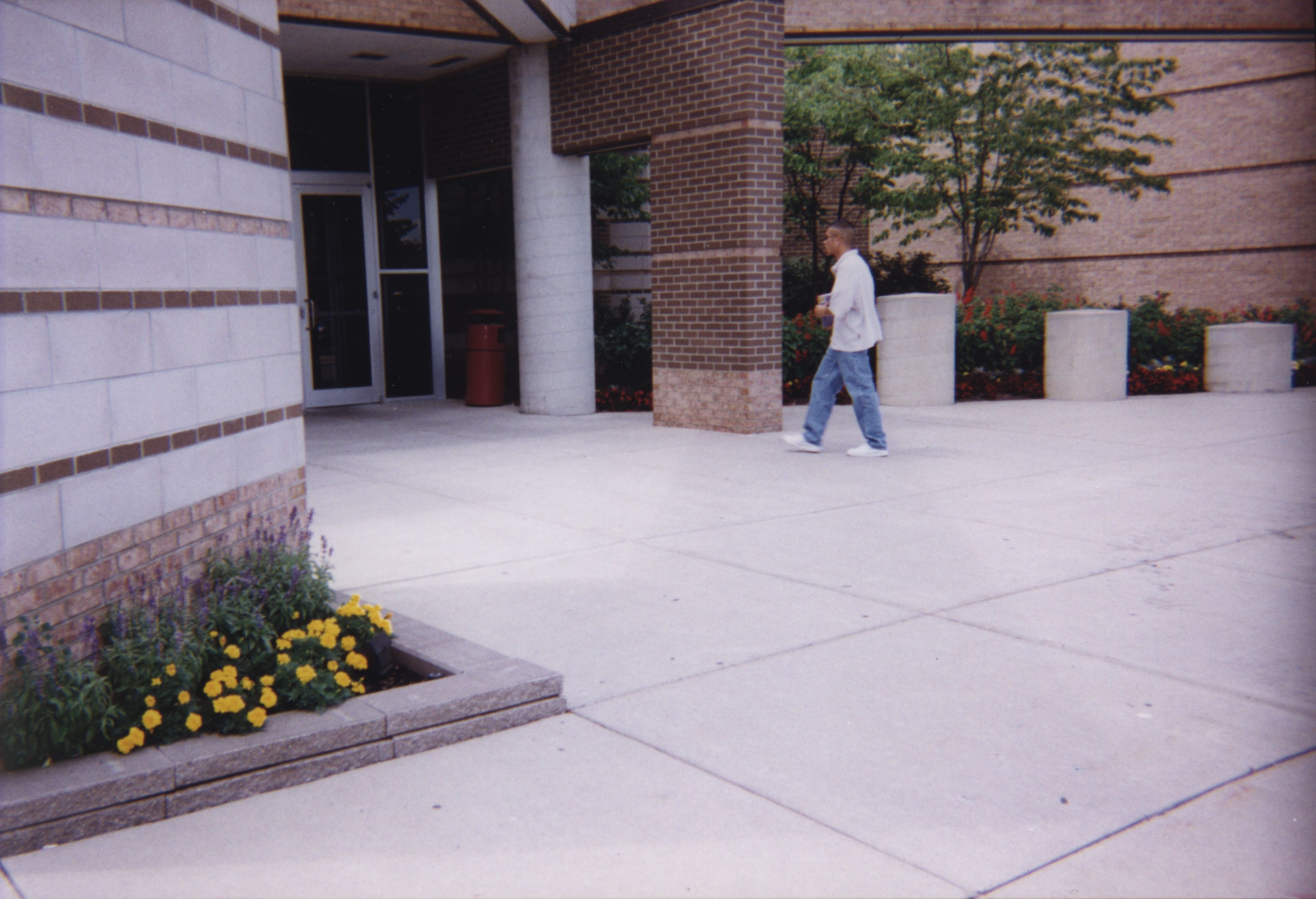 A man walking into the main entrance at the Troy Campus. (date unknown)
