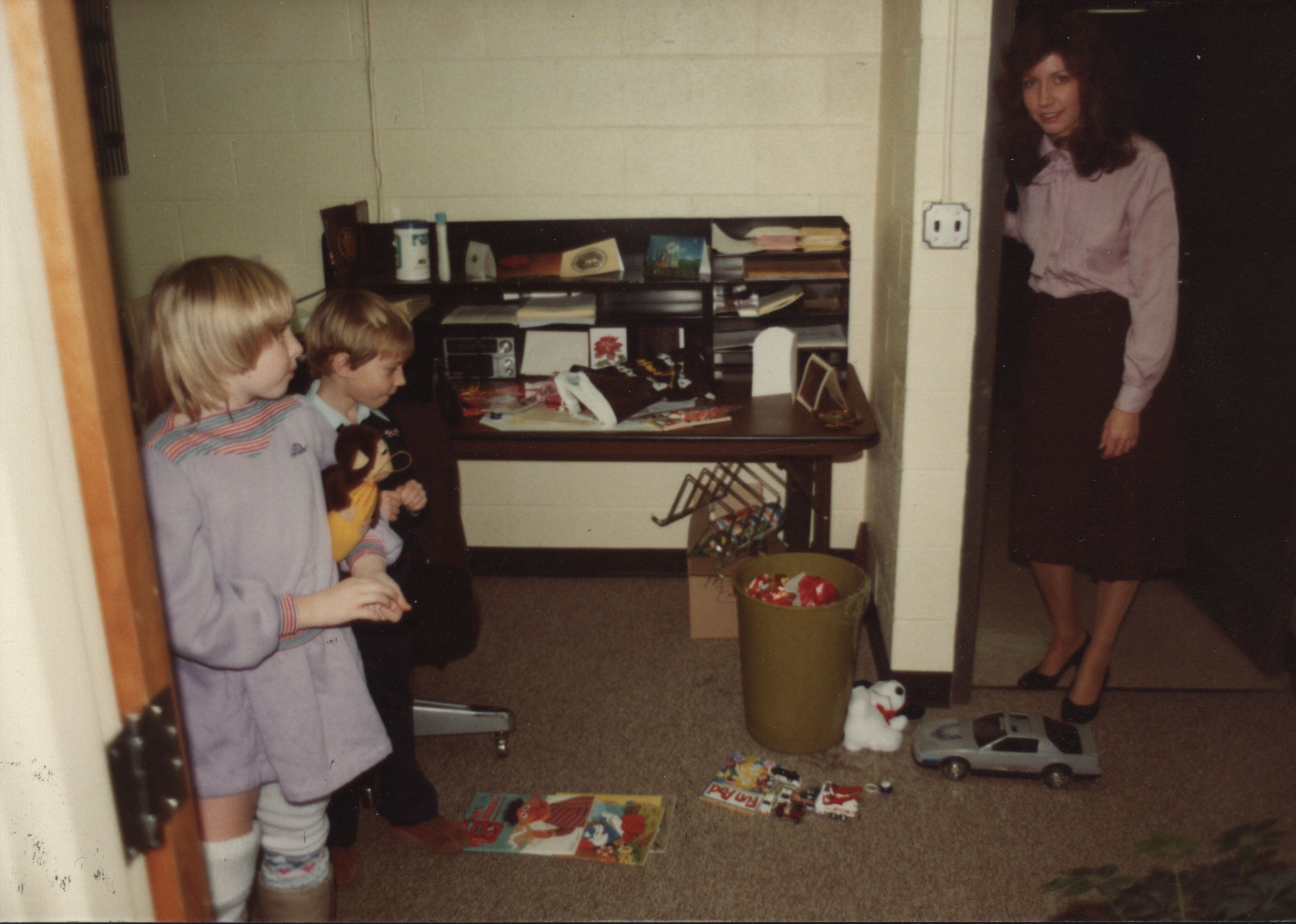 Two kids play in an office while a woman looks in from the door. (date unknown)