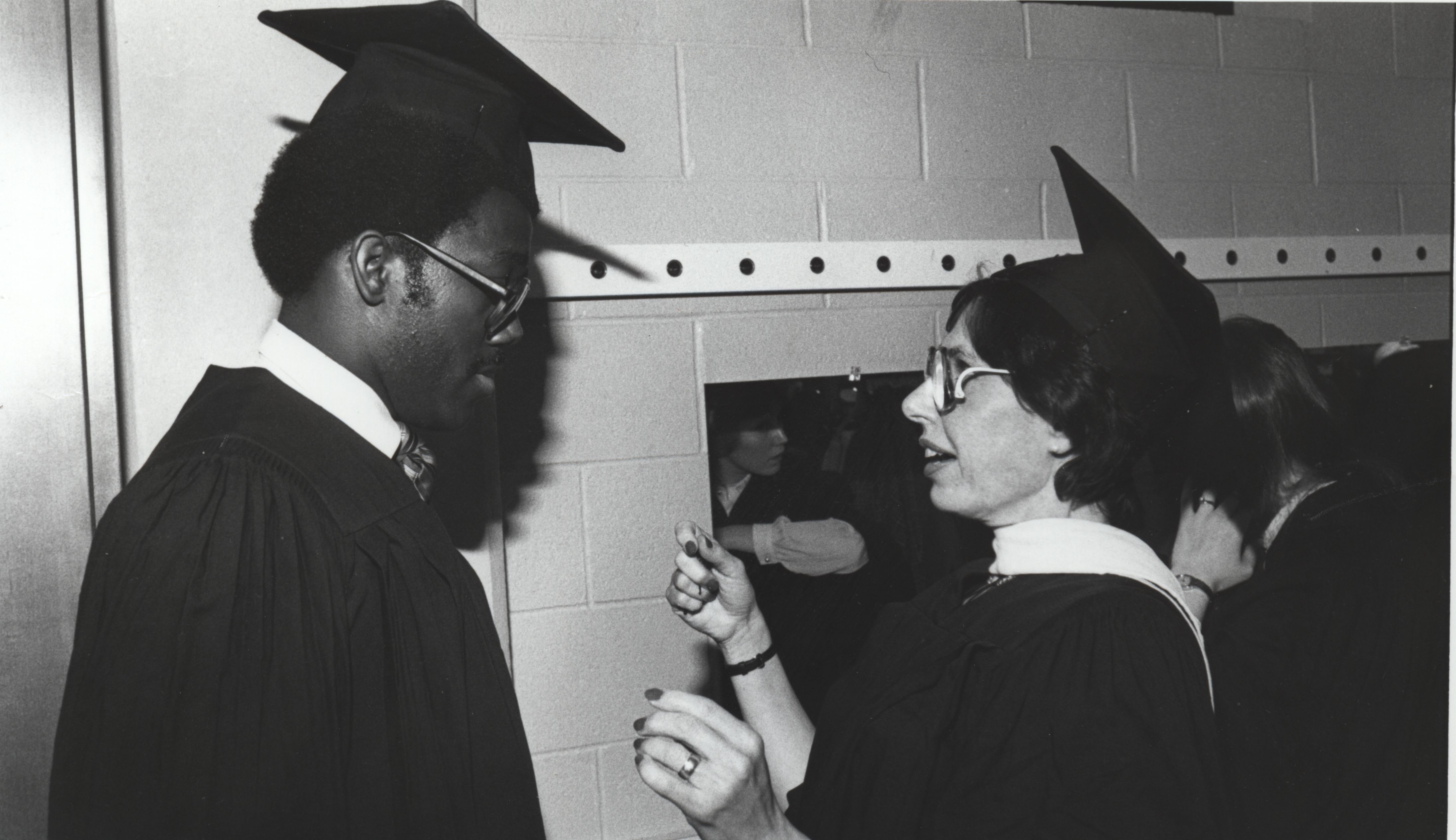 Barbara Alpern, Communications Professor, and man at commencement. (date unknown)