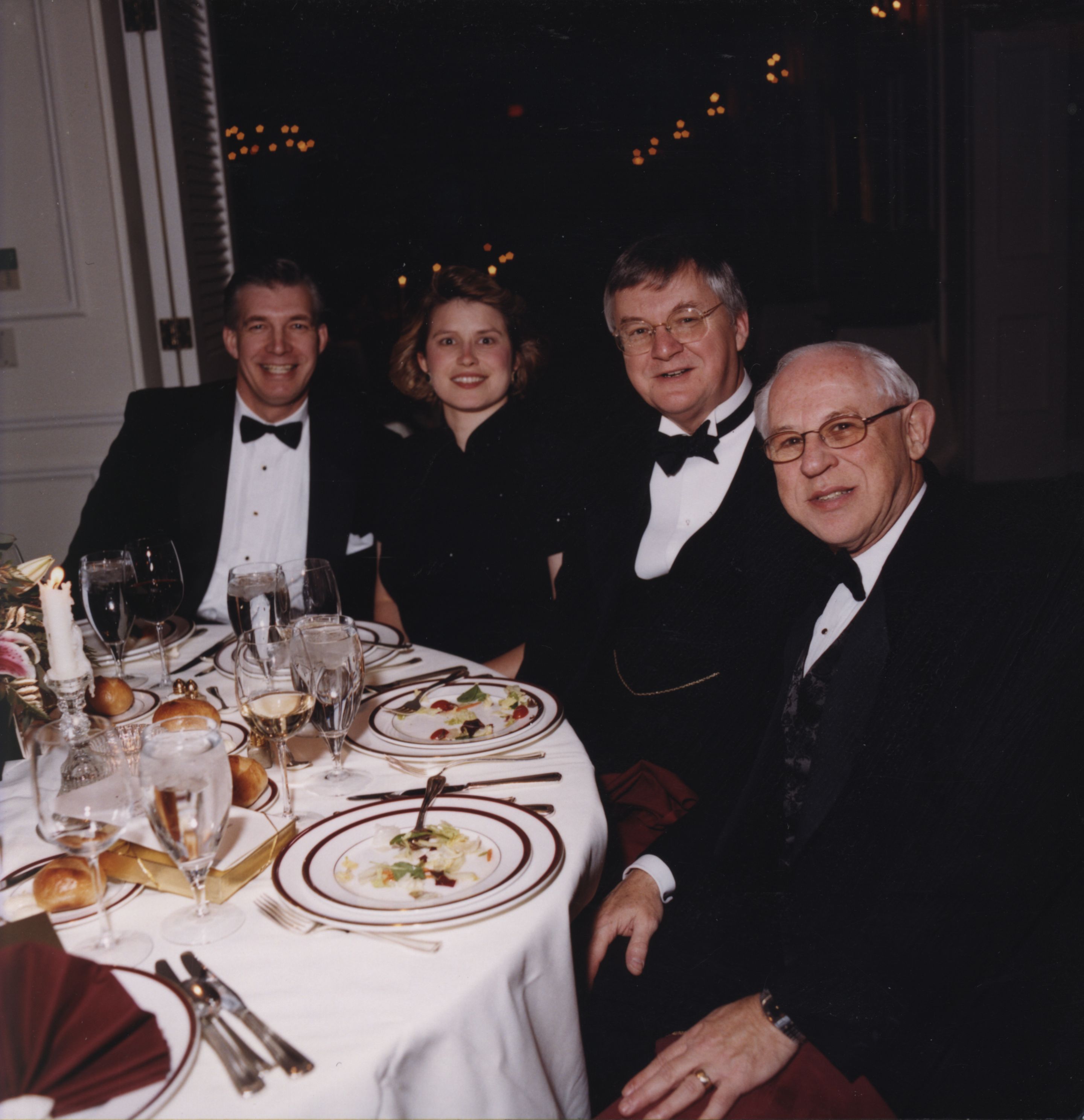 Harry Veryser, Jr., Joe Weglarz, Irwin Alpern, and a woman at a dinner event. (date unknown)