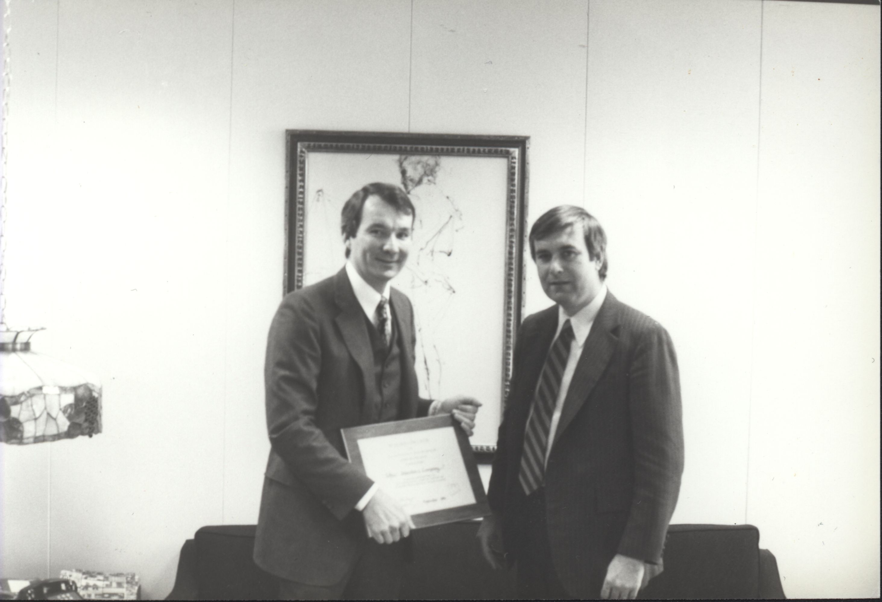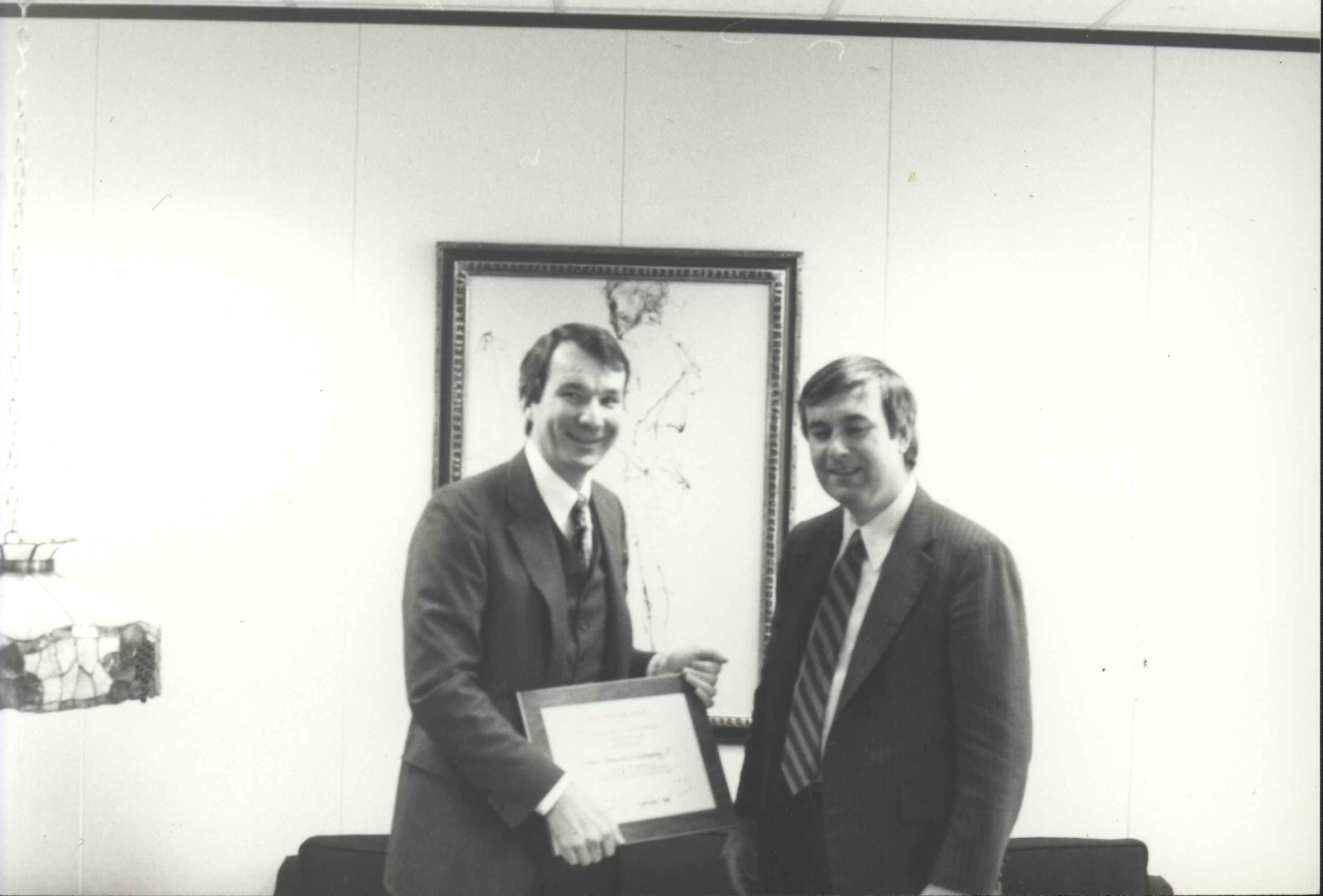 Jeff Barry (3rd President) holding a framed certificate standing next to an unidentified man. (date unknown)