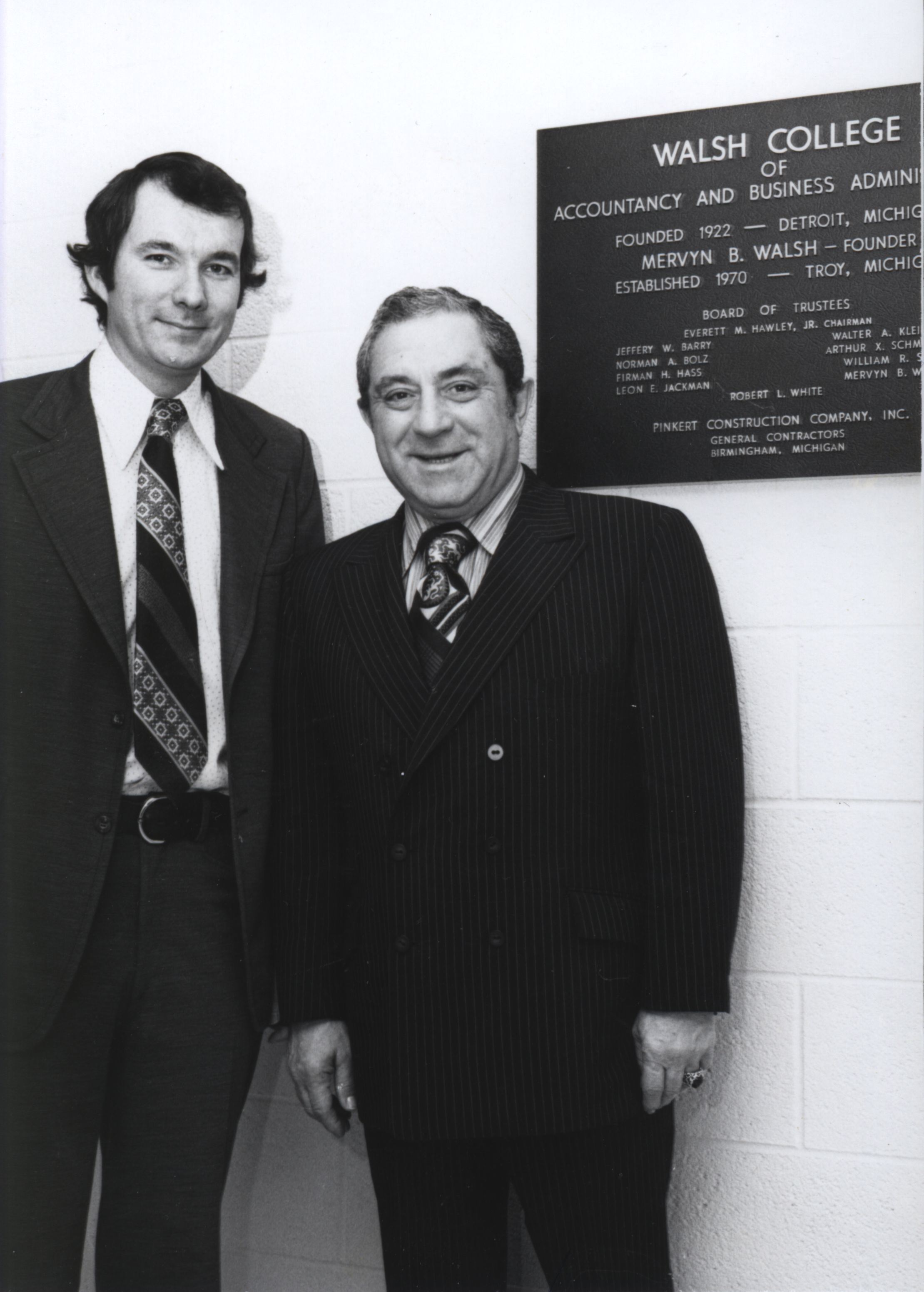 Jeff Barry (3rd President) and an unidentified man standing next to a Walsh College plaque. (date unknown)