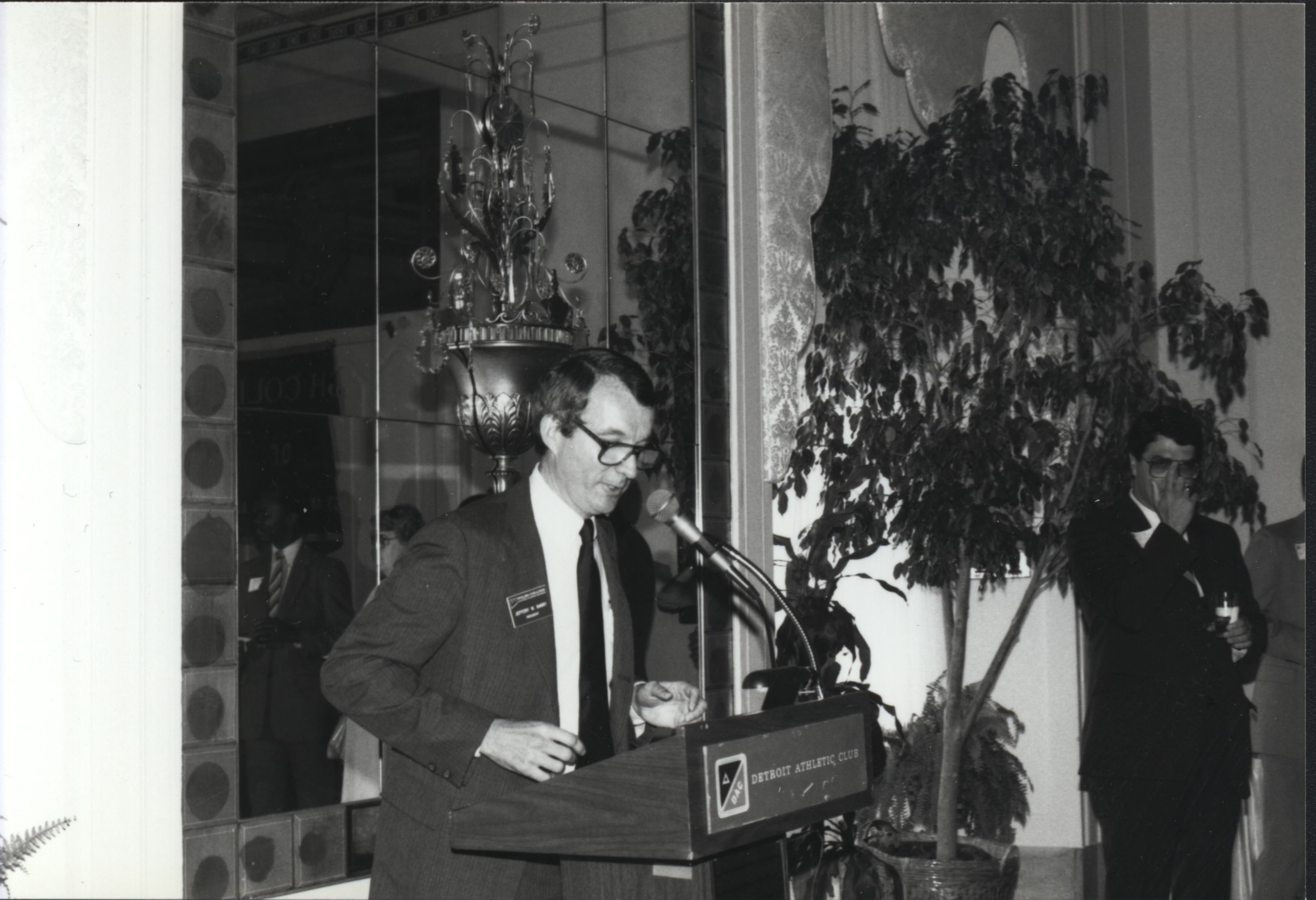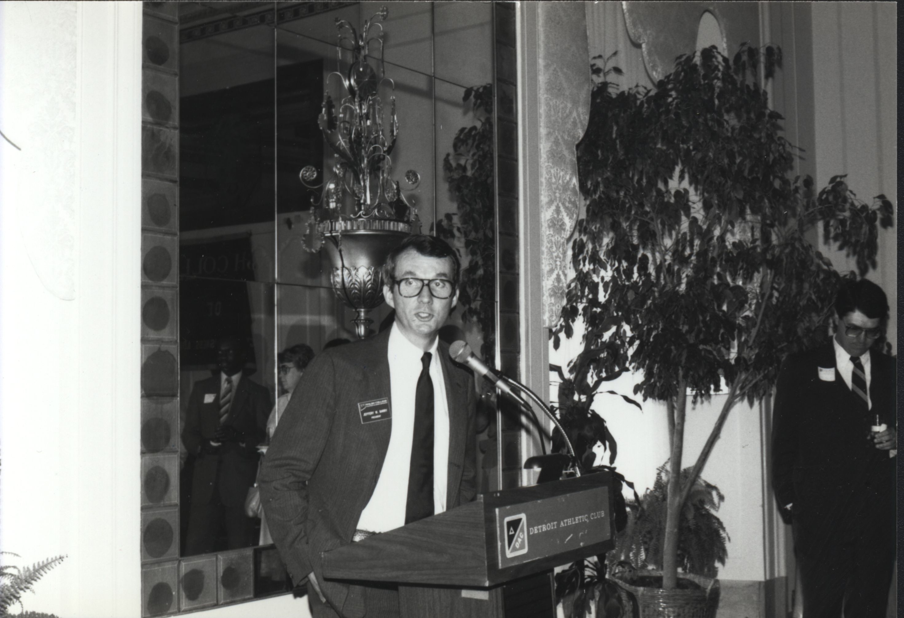 Jeff Barry(3rd President) speaking at a podium at the Detroit Athletic Club. (date unknown)