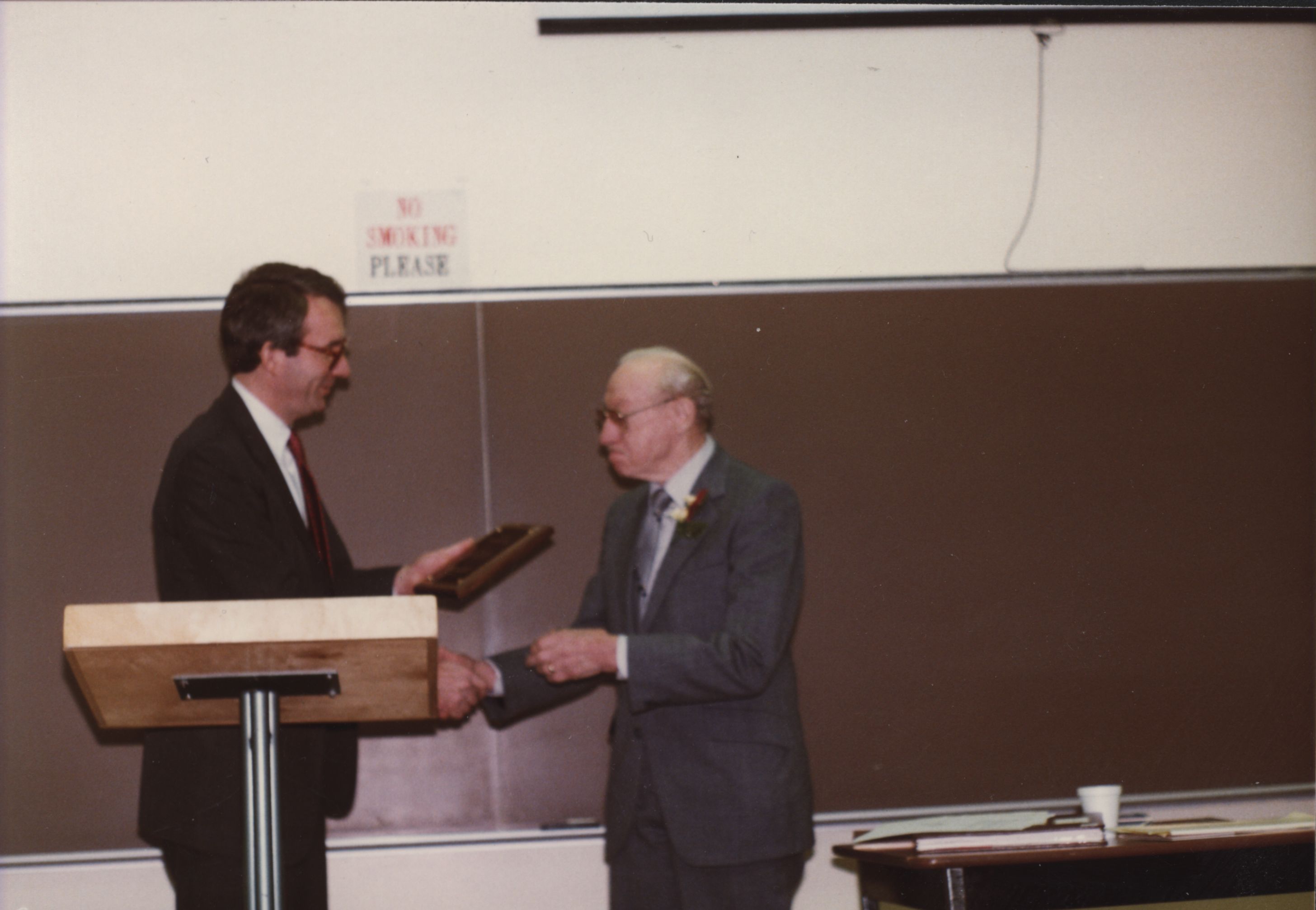 Jeff Barry (3rd President) shakes a man's hand and gives him a plaque. (date unknown)