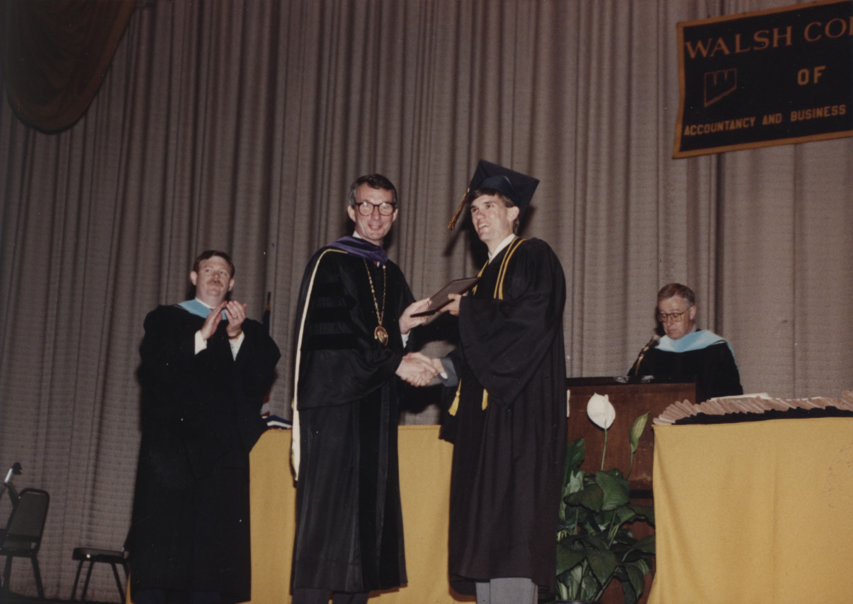 Jeff Barry (3rd President) presents a man with a plaque and shakes his hand. Dave Spencer (4th President) stands behind Barry. (date unknown)