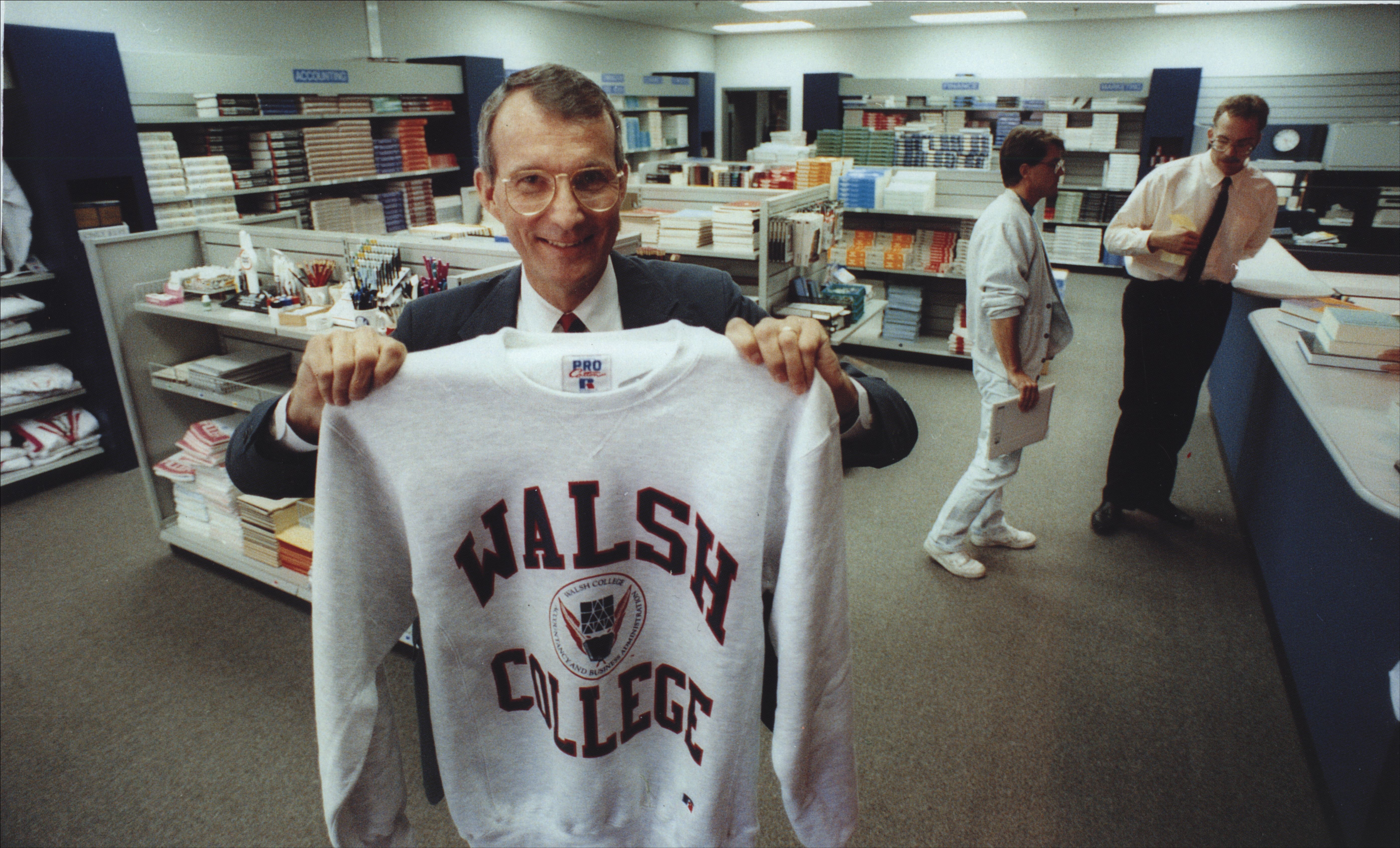 Jeff Barry (3rd President) holds up a Walsh College sweatshirt in the bookstore. (date unknown)