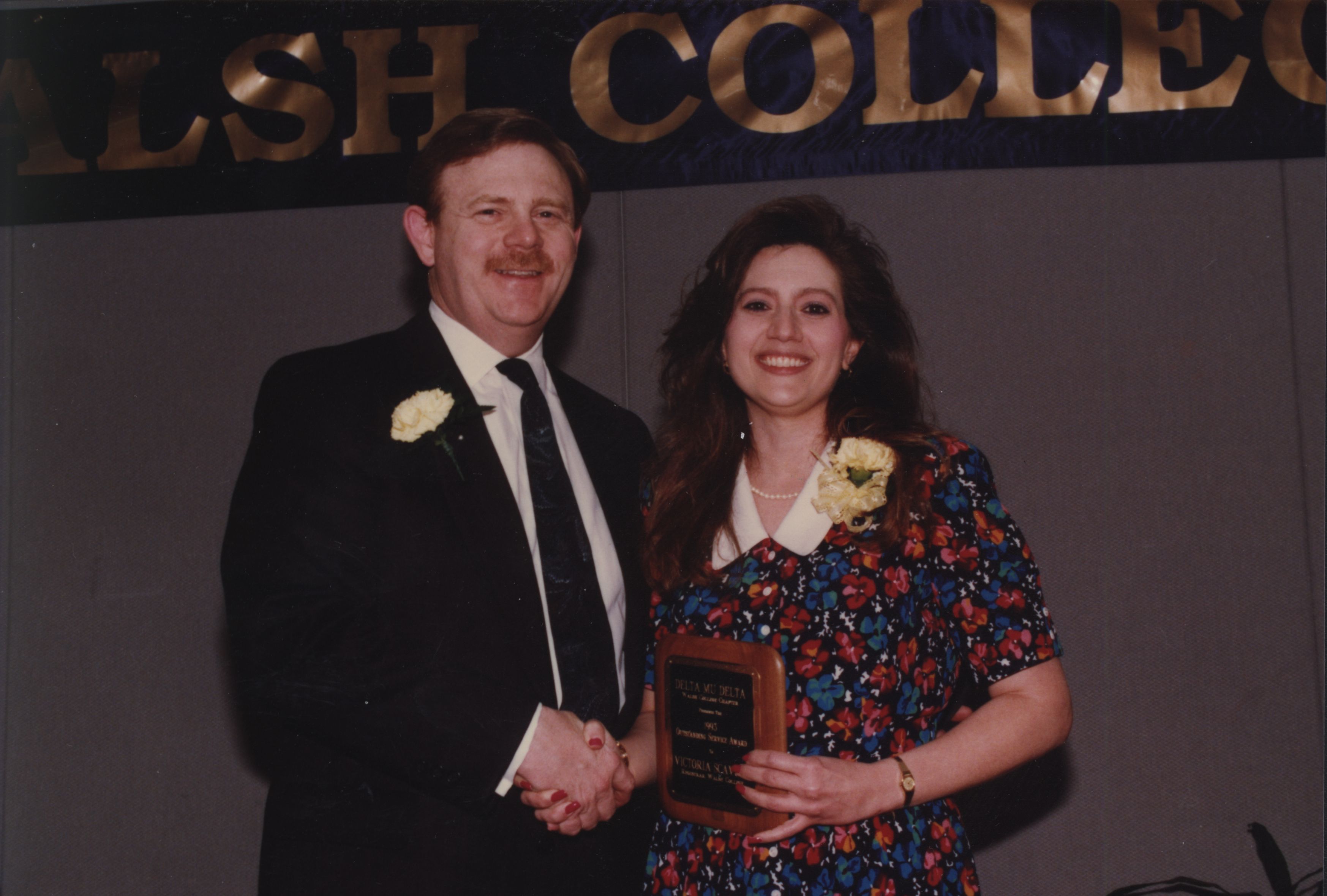 In 1993, Delta Mu Delta presented Vickie Scavone with an "Outstanding Service Award" for all of her dedication to commencement over the years. (from back of photo)